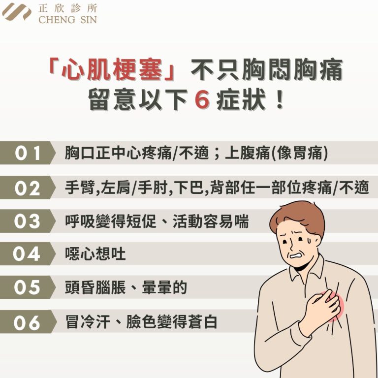 一般人想到心肌梗塞,通常都會直覺反應是「胸悶、胸痛」,事實上那是「急性心肌梗塞」發作才會有的症狀,有一半的人在心肌梗塞前根本不會有胸悶胸痛的症狀,反而在一個月前可能曾有胃痛、肩膀疼痛等症狀;所以如果出現下面這些症狀,而且持續 5 分鐘以上,表示血管正在慢慢堵塞,更需要特別注意才不會錯過警訊。