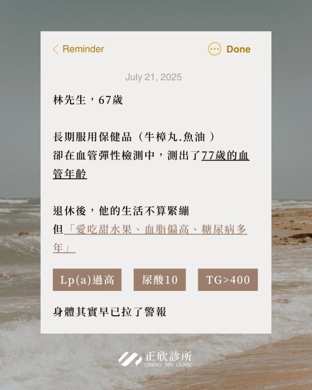 再加上Lp(a)偏高、三酸甘油脂破表、尿酸值達10,他的循環系統早就處在慢性堵塞與氧化壓力累積的風險中