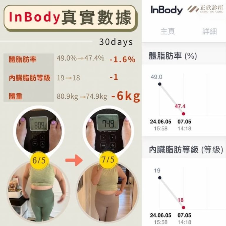 簡小姐,因為心血管的問題,在北醫心臟專科蕭卜源的建議下,來到正欣診所做EECP體外反搏的療程,透過一系列的療程規劃,簡小姐的心血管狀況獲得了改善。為了更進一步的改善自己的健康狀況,她參加了正欣診所的12周激瘦專案療程,透過營養師、保健食品以及療程的協助下,短短一個月,簡小姐從80.9公斤瘦到74.9公斤,體脂肪也從49%降到47.4%。簡小姐表示:「這一個月我都沒有餓到肚子,體重跟體脂卻下降了,我真的是超開心,接下來兩個月我會繼續努力!」