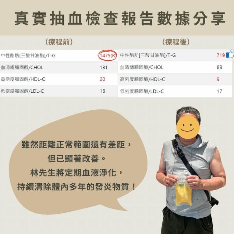 經過一次血液淨化療程,林先生的三酸甘油脂從1400多直接降到700多,雖然距離正常範圍還有差距,但已經取得了顯著的改善。林先生對此結果感到非常滿意,並計劃繼續進行定期的血液淨化療程,以持續清除體內多年的發炎物質、多餘的膽固醇和三酸甘油脂。再搭配營養師的飲食管理及藥物的協助控制,林先生表示:「我已經在期待看到自己抽血報告裡三酸甘油脂可以恢復成黑字,讓我跟我的家人不用再擔心!」