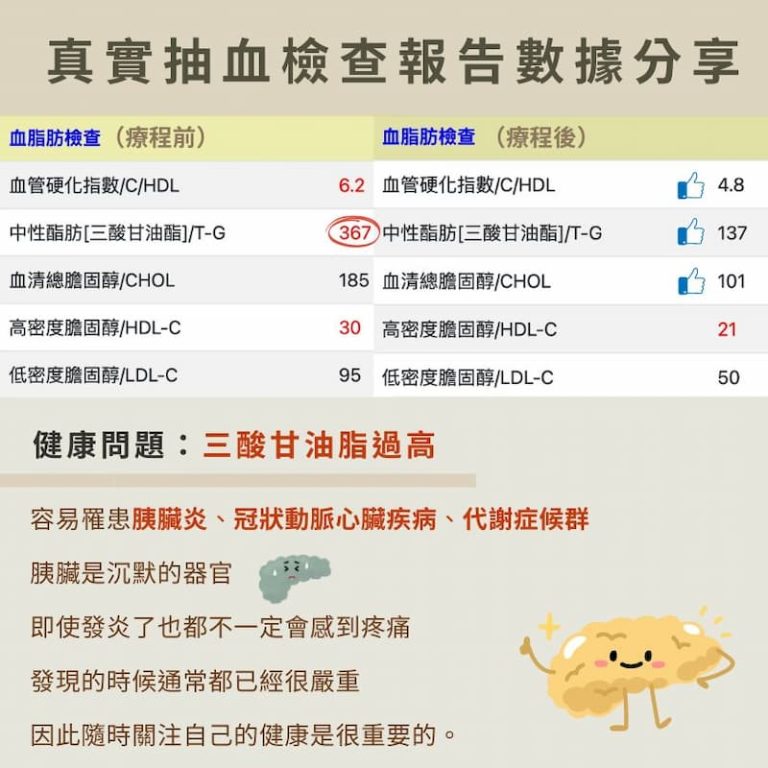 許先生其實來到診所的時候是沒有任何不舒服的症狀,直到自己抽血出來看到三酸甘油脂高達367,才驚覺,自己需要來一場大保養。正欣診所心臟科醫師表示:「三酸甘油脂過高,容易罹患胰臟炎、冠狀動脈心臟疾病以及代謝症候群,特別是胰臟炎,若急性發作很容易引起併發症,有生命危險。」胰臟是沉默的器官,即使發炎了時常也都不會感到疼痛,發現的時候通常都已經很嚴重,因此隨時關注自己的健康是很重要的。