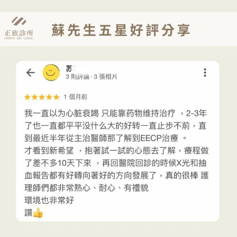 在協助蘇先生進行35次EECP療程的過程中,我們逐漸看到他的進步。他不吝於分享:「第二次療程後,我的睡眠品質改善,第六次後手腳不再冰冷,第九次後心臟科醫師告訴我,抽血報告和檢查數據有所改善,第十一次後我的體力和喘的情況顯著改善。」EECP療程不僅改善了蘇先生的身體狀況,也讓他重新燃起了對生活的信心與期待。透過EECP的療程,蘇先生得以重拾健康,更重要的是,他在正欣診所找到了長期保養心臟、提高生活品質的方法。