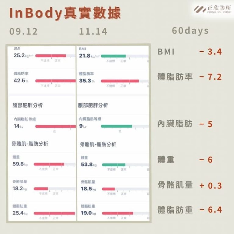 在營養師和醫療團隊的陪伴下,蕭小姐經過了兩個月的療程,BMI、體脂肪,以及讓人擔憂的內臟脂肪都大幅下降!她不僅能夠再次穿上衣櫃深處的美麗衣服,還改善了曾因為過重引發的關節不適、胃酸逆流、疲勞易喘等問題!蕭小姐的蛻變驚豔了周圍親友,激勵了同樣在美食與體態間掙扎的朋友正視健康問題,加入健康管理的行列,向著更健康的生活邁進!