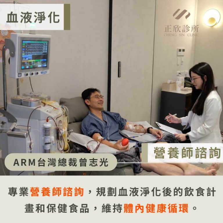 全球高效能運算技術領導廠商 ARM 的台灣區總裁,曾志光,面對工作強大的壓力、無數會議和應酬,即使非常自律的他已經有在控制飲食和運動,仍然無可避免的面臨膽固醇偏高、尿酸偏高、慢性腎病變等等的情況!身為一家之主的他十分緊張,因為之前曾在正欣診所做EECP體外反搏療程,曾志光選擇在正欣診所進行血液淨化的療程。曾志光表示:「之前在醫院就知道自己有膽固醇偏高的問題但是因為工作的因素,實在無法改善這個狀態,幸好有正欣診所幫我規劃一系列的療程保養我的身體,我感覺自己都變得更年輕了!」