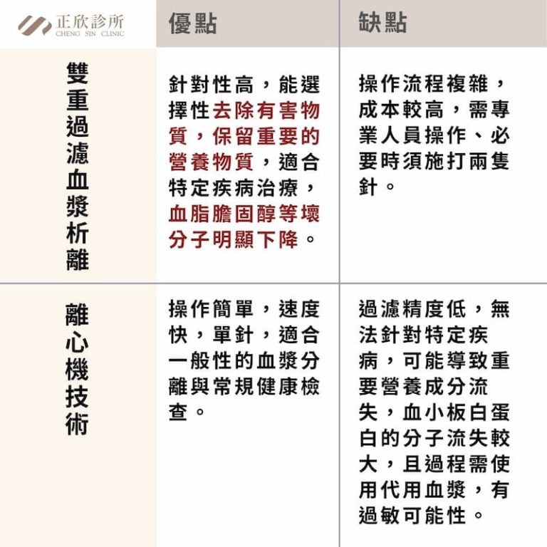 在眾多血液淨化技術中,雙重過濾血漿析離(DFPP)和離心機技術是兩種被廣泛應用的技術。針對每種技術的目標不同,對健康的影響方式也有所差異。DFPP技術以其精密的過濾能力,針對性地去除血漿中的大分子有害物質,特別適合需要精細調控身體內環境的人群。而離心機技術則以其快速簡便的分離血液成分的方式,能夠有效分離血漿和其他成分,是日常健康檢查和基礎血漿處理的常用工具。這兩種技術各具特色,因此在應用上也針對不同的健康需求。